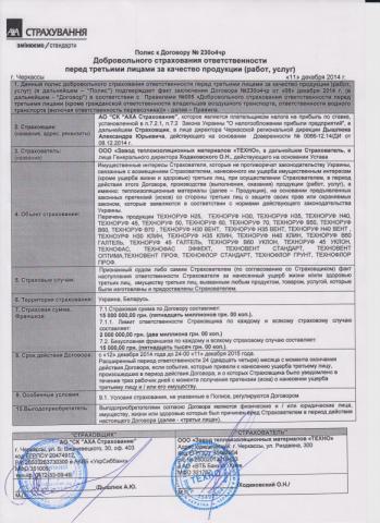 «ТЕХНО» уклав договір страхування цивільної відповідальності з компанією «АХА «Страхування», за яким страховик відшкодовує збиток, заподіяний в результаті прихованих недоліків матеріалів, у розмірі до 15 млн гривень. Страховий захист за даним договором діє протягом 2 років на території України та Білорусі. На заводі застосовується багатоступінчастий контроль якості, який включає вхідний моніторинг усіх видів сировини, заміри відповідності випускається теплоізоляції в процесі виробництва та тестування фізико-механічних характеристик готової продукції в лабораторії. Таким чином, якість випущених матеріалів знаходиться на рівні світових стандартів, а його додатковою гарантією виступить добровільне страхування відповідальності виробника, закріпленої у відповідному сертифікаті компанії «АХА «Страхування».