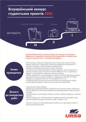 Компанія УРСА рада повідомити про початок чергового конкурсу для студентів та випускників будівничих та інженерних спеціальностей на кращу роботу з використання сучасних технологій тепло- та звукоізоляції будівель.