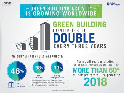Темпы роста количества зеленых зданий впечатляют! В зависимости от страны, объемы зеленого строительства удвоятся или даже утроятся до 2018 года! Об этом идет речь в Исследовании Dodge Data & Analytics. С полным текстом Исследования можно будет ознакомиться на сайте компании (http://analyticsstore.construction.com/) в первом квартале 2016 года, а основные цифры и факты можно увидеть, например, вот тут: http://naturalleader.com/wp-content/themes/natlead/pdf/World%20Green%20Trends%20ExecSummary_1110%20(1).pdf